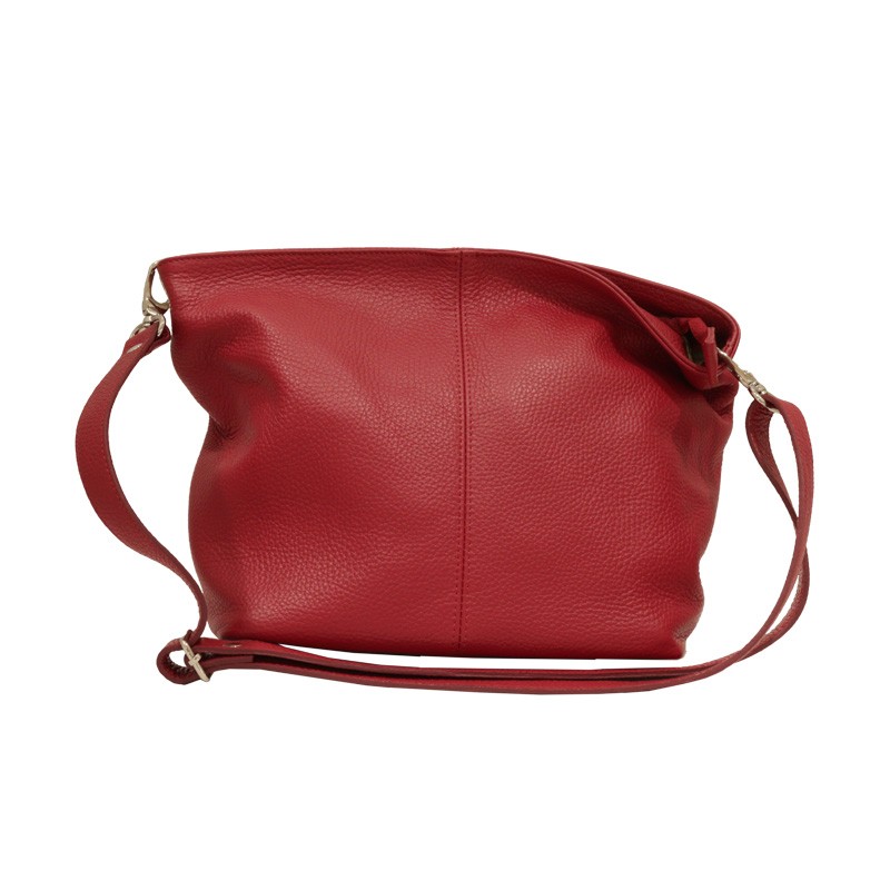 Bolso de piel blanda. Ligera y de tamaño mediano con correa corrediza de largo ajustable. En el interior dispone en mitad del bolso de un compartimento separador con cremallera y otro pequeño bolsillo en el lateral.