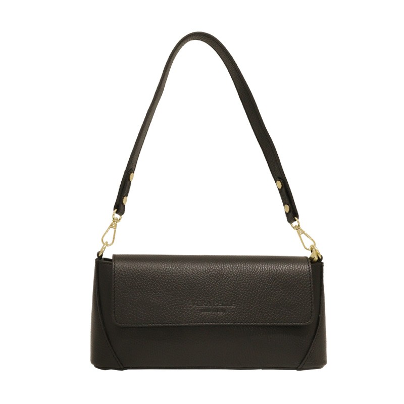 Bolso piel para llevar bajo el brazo, diseño con solapa magnética y cierre de cremallera. En el interior tiene un bolsillo lateral con cremallera. Incluye correa larga removible.