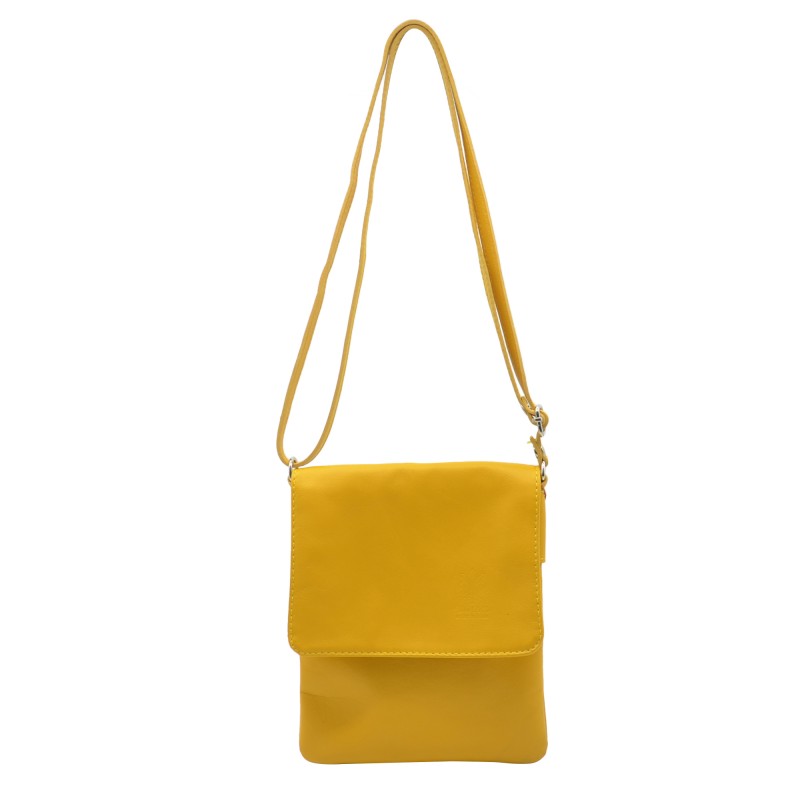 Bandolera de piel pequeña con solapa. Modelo sencillo con un bolsillo exterior trasero con cremallera y en el interior del compartimento principal, un pequeño bolsillo lateral.