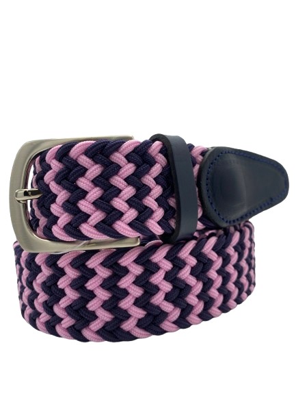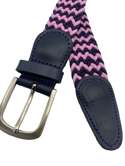 Cinturón elástico trenzado en tonos marino y rosa, con acabados en piel de vacuno de alta calidad y hebilla metálica en color plata mate. Su diseño versátil y cómodo se adapta a la cintura sin necesidad de perforaciones, ofreciendo un ajuste perfecto y un estilo elegante y casual al mismo tiempo. Ideal para combinar con looks informales o semi-formales.
