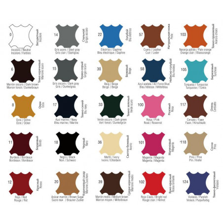06 – Marrón oscuro, 08 – Ocre, 100 – Rosa, 102 – Rojo claro, 105 – Turquesa, 11 – Burdeos, 117 – Cervato, 12 – Rojo, 14 – Gris Acero, 15 – Gris oscuro, 17 – Azul Marino, 18 – Negro, 20 – Azucar Marrón, 33 – Verde oscuro, 39 – Marrón medio, 57 – Cuero, 00 Neutro